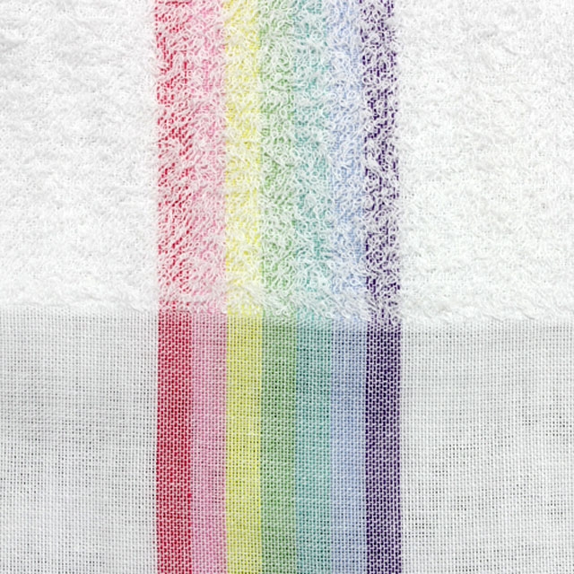 | 説明 | レインボーカラーのラインをデザインした平地付きフェイスタオル |